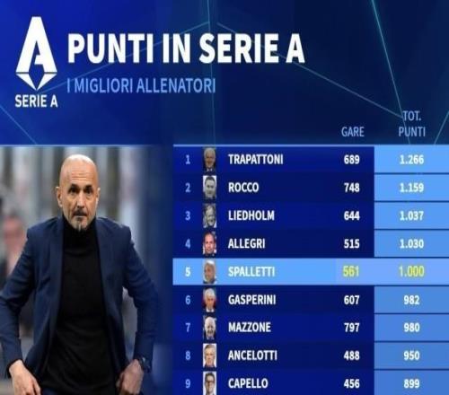 斯帕莱蒂达成意甲1000分里程碑意甲 11-09 11:24尤文0比0都灵,凭借这场平局,斯帕莱蒂拿到执教生涯意甲第1000分...