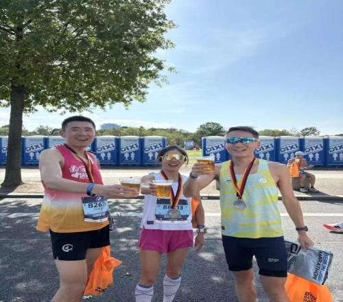 完赛后的熊娟,畅饮柏林的特色啤酒