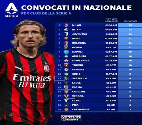 北京时间10月8日,德转统计出了意甲球队本月国际比赛日被征召的球员人数,AC米兰15人得到征召排名第一,国际米兰和尤文图斯则各有13人入选国家队。