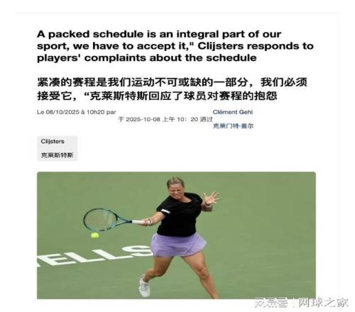 网坛愈演愈烈的赛程过长争议引发球员不满,斯瓦泰克、阿尔卡拉斯、高芙、萨巴伦卡纷纷发声指责现在的赛程安排非常不合理。然而,对此,前世界第一克里斯特尔斯直言不讳地指出,以她曾经在球员工会的经验来说,密集赛程的根本原因是因为很多赛事必须要存在,而这也是为了照顾很多低排名球员的参赛需求,因为要保证全年都有比赛进行,且任何赛程不可能让所有人满意。