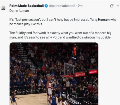 他动作的流畅度和脚步细节,完全符合现代大个子球员的理想模板;这下也不难理解,开拓者队为何愿意押注他的未来潜力了——他身上的上升空间实在太值得期待。