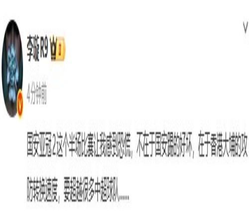 媒体人社媒发文热议国安1-2落后,李璇写道:“国安亚冠2这个半场比赛让我感到恐慌,不在于国安踢的好坏,在于香港大埔的攻防转换速度,要超越很多中超球队。”