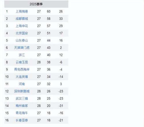 中超最新积分榜