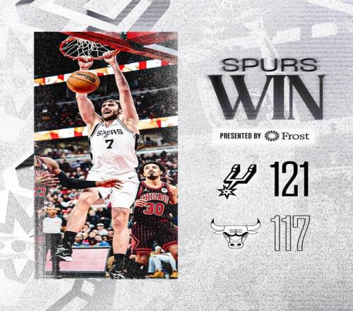 许尔特外线打铁,卡斯尔抢下篮板被犯规,随后2罚全中,马刺领先5分得以锁定胜局。许尔特2罚1中,文班亚马2罚全中,道苏姆上篮得分,比赛时间走完。最终,马刺以121比117险胜公牛,得以上演13分逆转。圣安东尼奥实现了3连胜,继续排名西部第2。