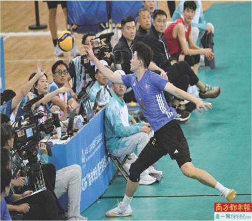 11月8日,排球男子成年组小组赛,上海队球员卞世杰跑到场边救球。