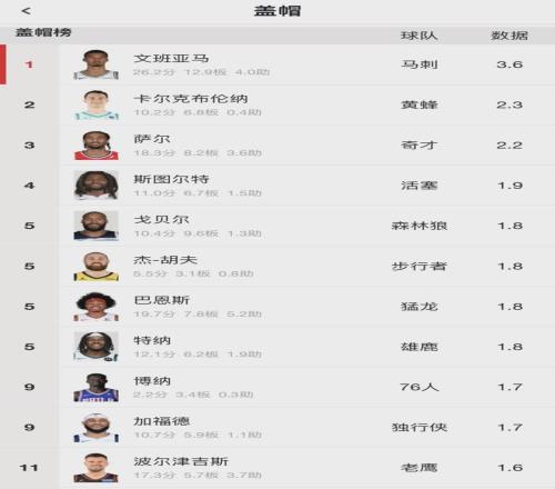 赛季至今,文班亚马首发出战12场比赛。场均出战34.7分钟,得到26.2分12.9篮板4助攻1.1抢断3.6盖帽3.6失误。投篮命中率50.2%,三分命中率34.5%,罚球命中率85.7%。场均得分联盟第15,场均篮板第2,场均盖帽第1!