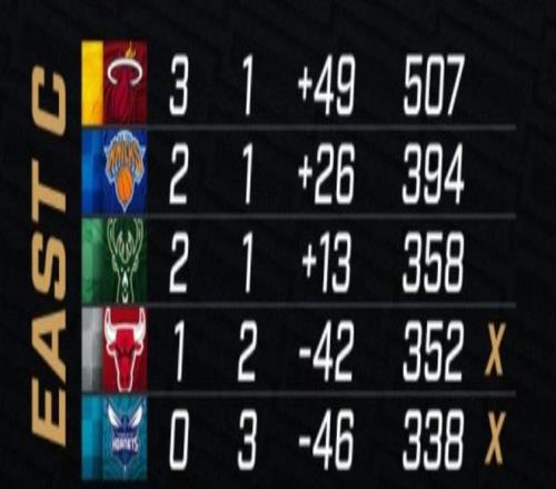 东部C组:热火3胜1负锁定前2,公牛和黄蜂提前出局,尼克斯和雄鹿都是2胜1负还有争第1或第2的希望。