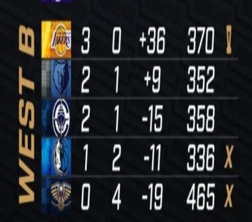 西部B组:湖人提前晋级,灰熊和快船最后1场正面交手,赢球的3胜1负小组第2,将和A组第2比较净胜分。独行侠、鹈鹕提前出局。