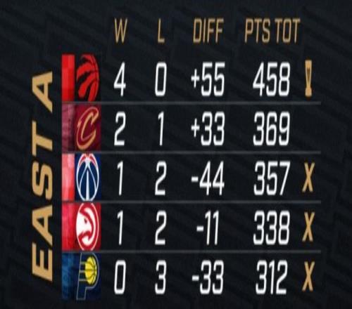 东部A组:猛龙4连胜提前晋级,步行者0胜3负提前出局。而因为后面东部C组的第2确定是3胜1负,所以奇才和老鹰就算是小组第2也会出局,因此A组悬念只剩下骑士了。